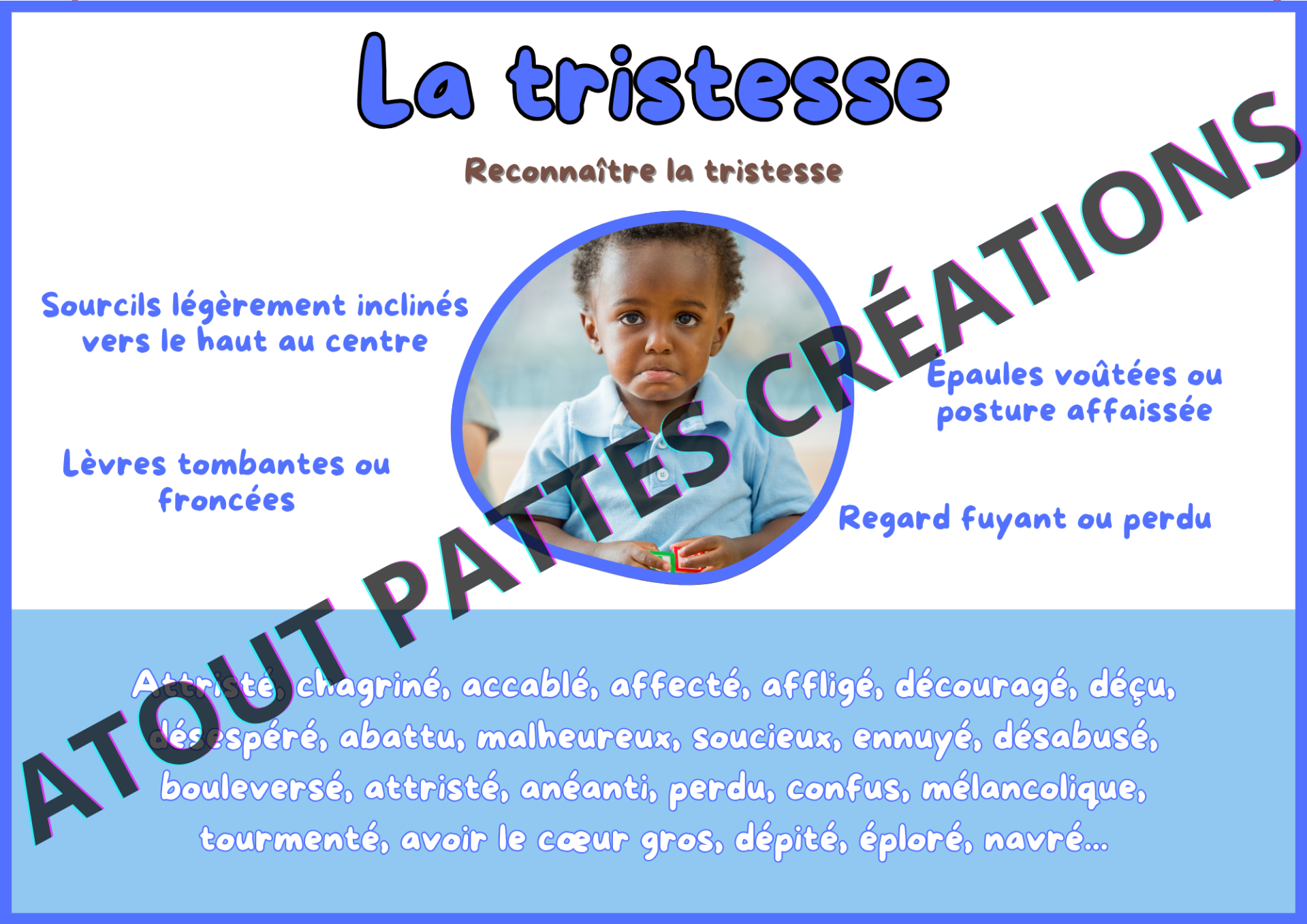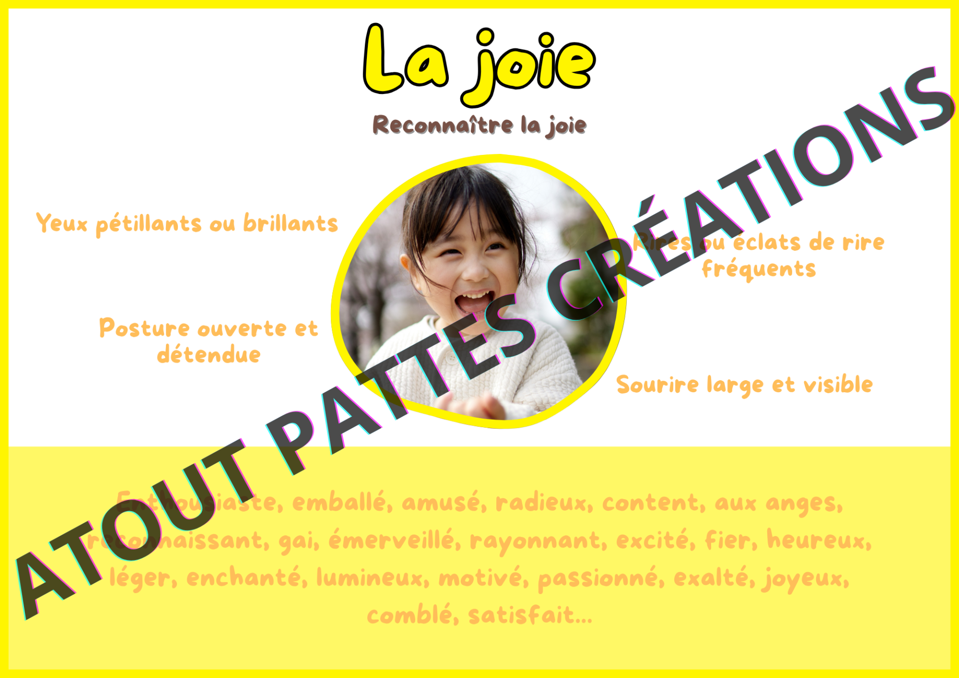 Je suis ravie de vous présenter mon dernier outil conçu spécialement pour aider les enfants à identifier et à comprendre leurs émotions. Ce joli support est non seulement une ressource précieuse pour les jeunes, mais il offre également une partie explicative dédiée aux parents, leur permettant ainsi de mieux accompagner leurs enfants.